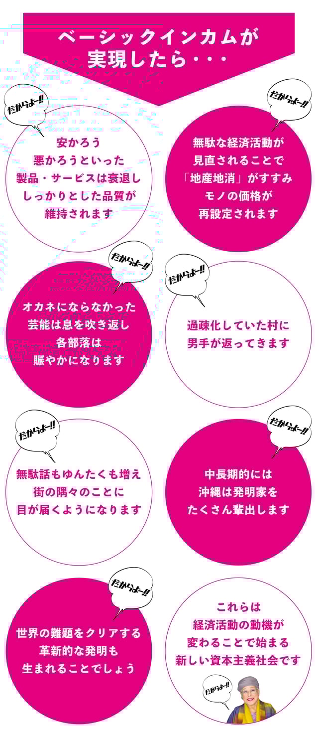 犯罪は減少し貧困問題も解決します。沖縄の米軍基地問題についても影響を与えることになるでしょう。基地問題も見方をかえれば経済問題・オカネの問題だからです。
